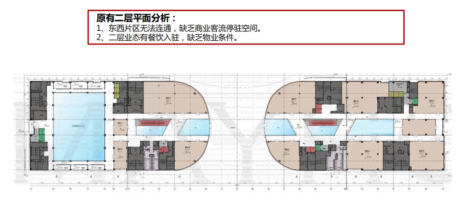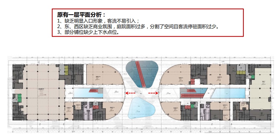 ①一層入口廣場(chǎng)增設(shè)景觀小品,烘托入口商業(yè)氛圍 ②二層中部增設(shè)連廊,加強(qiáng)商業(yè)東西貫通,增強(qiáng)商業(yè)氛圍,利于客流游逛