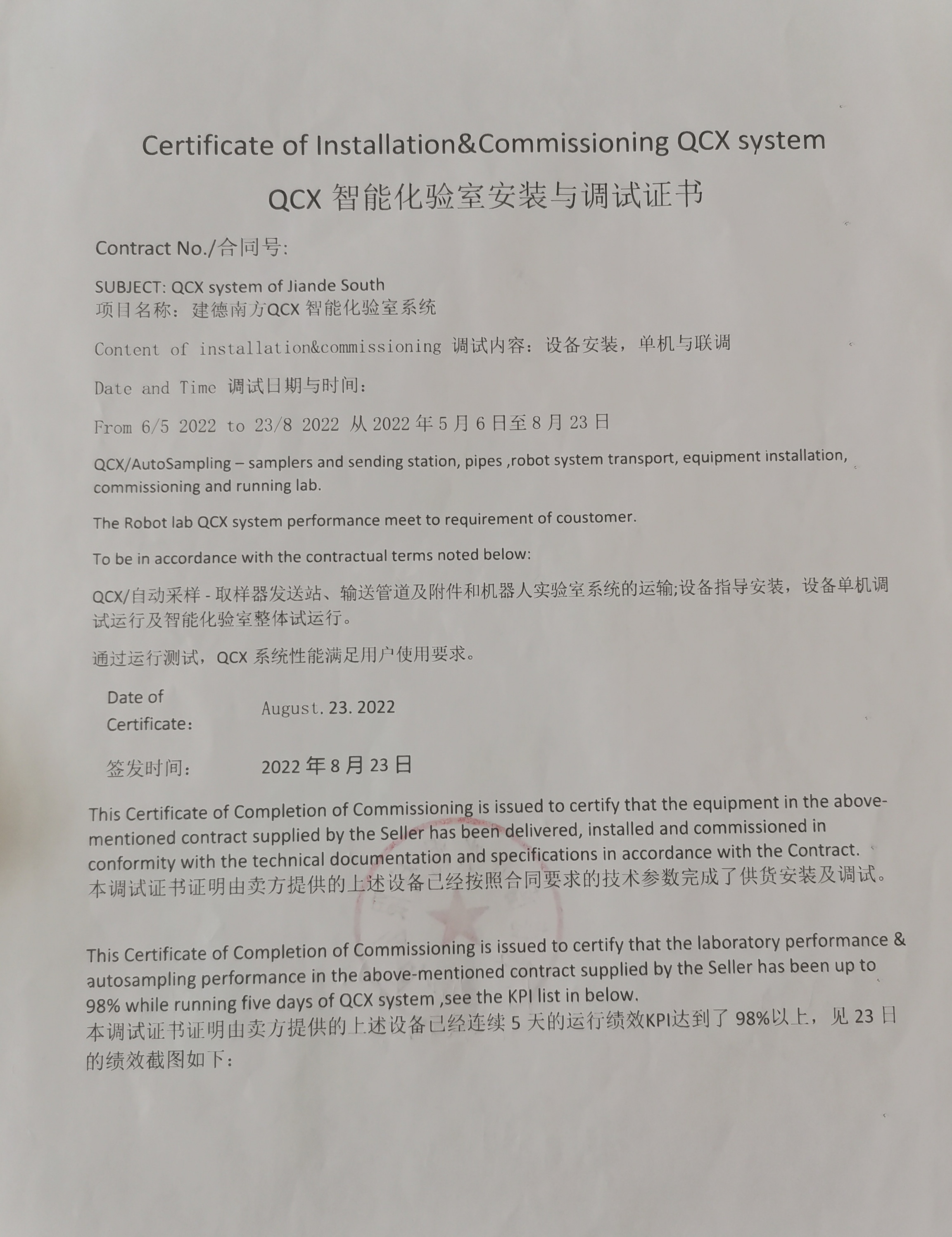 本次QCX系統(tǒng)設(shè)備由HNBMI自行安裝,艾法史密斯公司指導(dǎo)調(diào)試,實(shí)驗(yàn)室建設(shè)過(guò)程中,我院項(xiàng)目部合理制定搭建計(jì)劃,主動(dòng)配合業(yè)主生產(chǎn),全力克服疫情難艱,高效完成了本次建造任務(wù),并順利通過(guò)了系統(tǒng)的性能測(cè)試,客戶(hù)給予高度認(rèn)可。