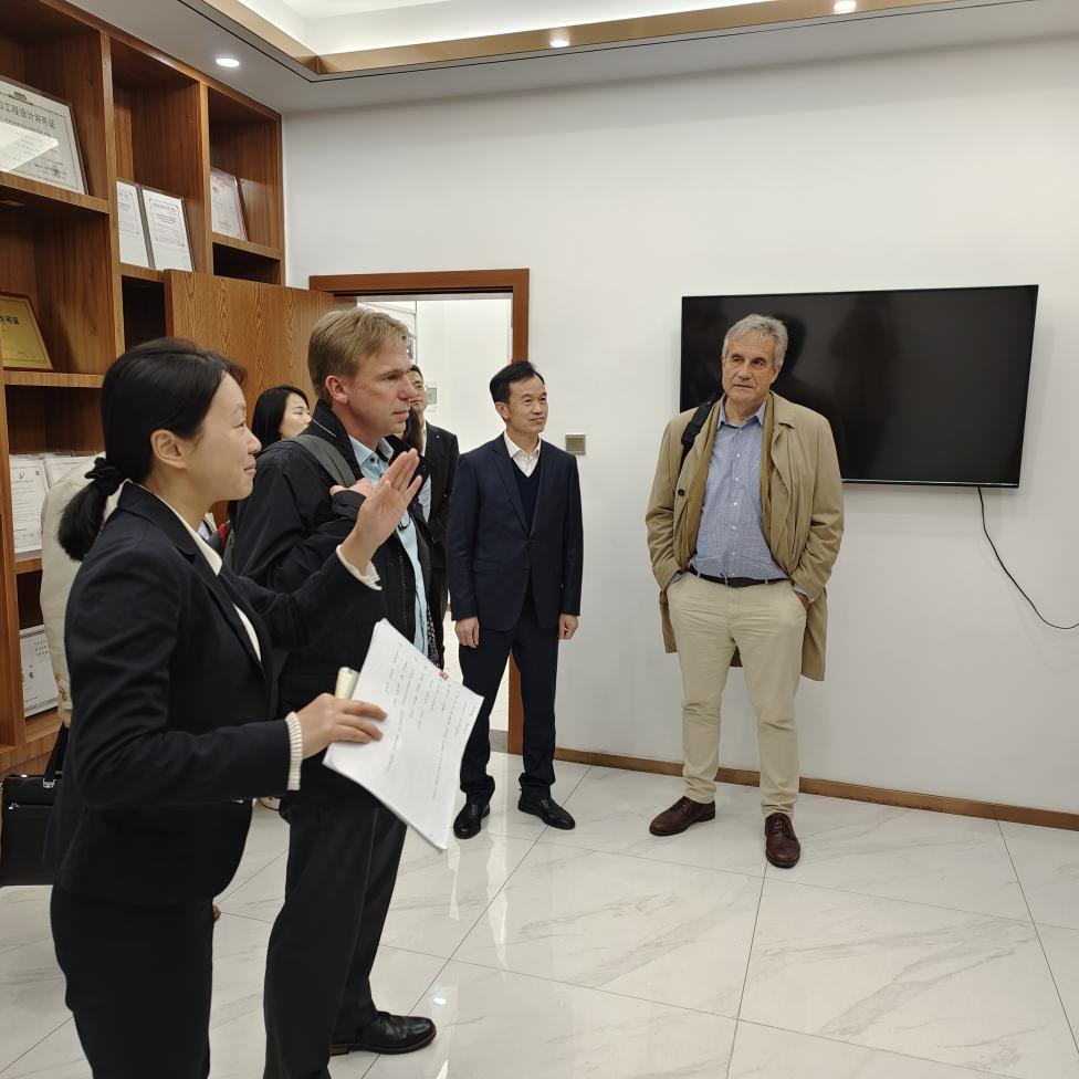 HNBMI副董事長劉忠良對Jochem先生一行表示熱烈歡迎,并陪同參觀展廳,了解HNBMI的發(fā)展歷程、業(yè)務(wù)板塊、資質(zhì)建設(shè)、專利證書和企業(yè)榮譽等情況。